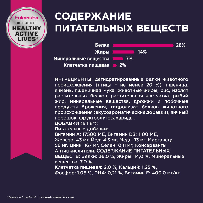 Ингредиенты: дегидратированные белки животного происхождения (птица – не менее 20 %), пшеница, ячмень, пшеничная мука, животные жиры, рис, изолят растительных белков, растительная клетчатка, рыбий жир, минеральные вещества, дрожжи и побочные продукты брожения, гидролизат белков животного происхождения (вкусоароматические добавки), яичный порошок, фруктоолигосахариды.
