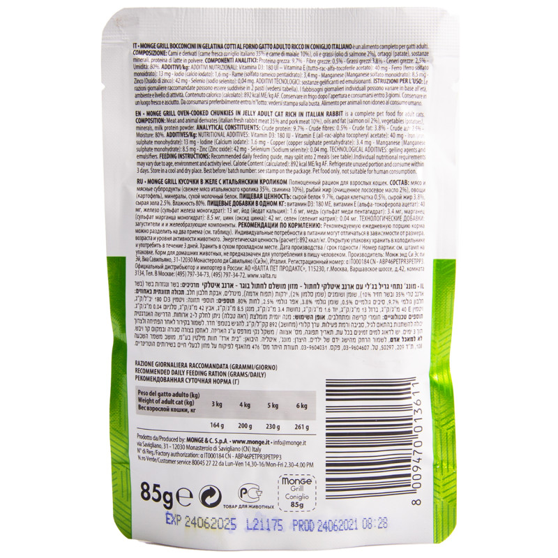 Monge (Монж) Cat Grill полнорационные беззерновые паучи из мяса итальянского кролика для взрослых кошек и котов 85 г.