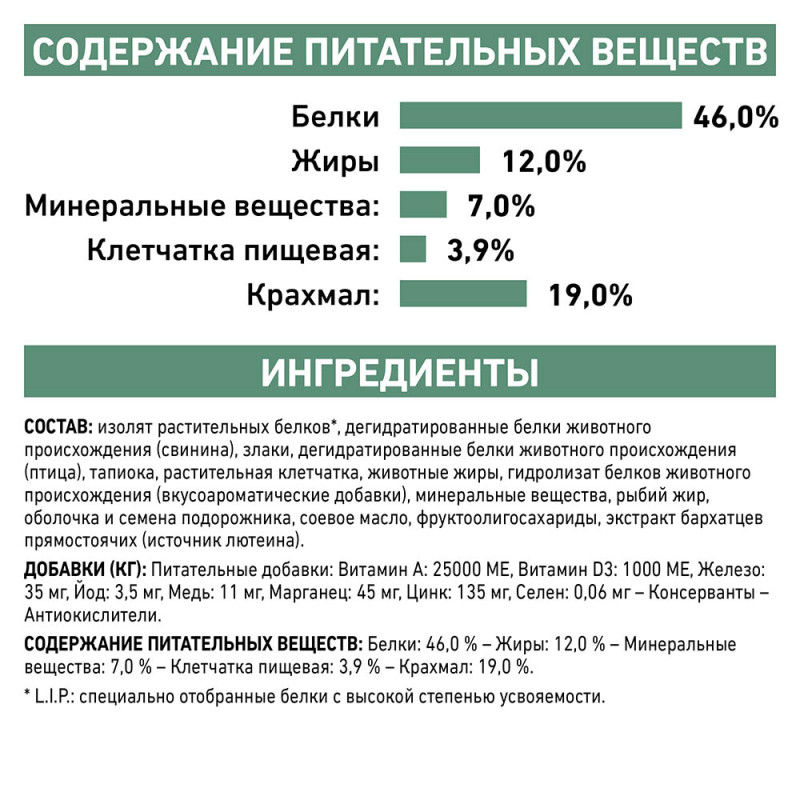Ингредиенты: дегидратированные белки животного происхождения (птица), ячмень, пшеничная клейковина*, кукурузная клейковина, тапиока, изолят белка сои*, животные жиры, гидролизат белков животного происхождения (вкусоароматические добавки), растительная клетчатка, экстракт цикория, рыбий жир, оболочка и семена подорожника, минеральные вещества, фруктоолигосахариды, соевое масло, экстракт бархатцев прямостоячих (источник лютеина).